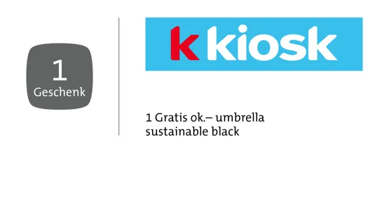 1 Gratis ok.– umbrella sustainable black. Ab einem Mindesteinkauf von CHF 30.–. Einmalig gegen Vorzeigen dieses Bons im Geschäft.