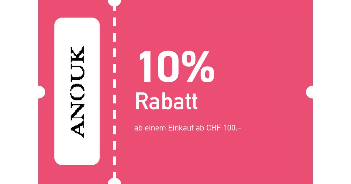 Einlösbar nur im ANOUK Kriens Pilatusmarkt. Gültig vom 02.03.2026–02.04.2026. Nicht kumulierbar mit anderen Rabatten/Promotionen oder Guthaben Kundenkarte. Nicht gültig auf Geschenkkarten und Online-Käufe.