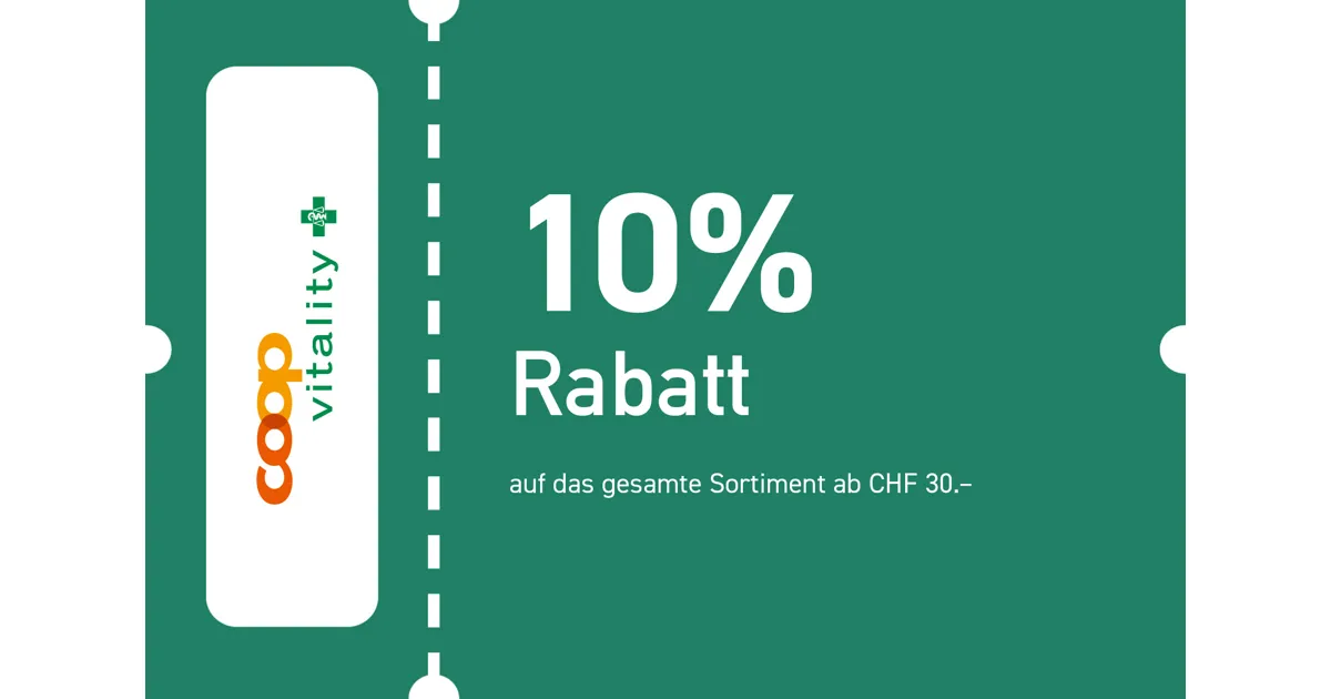 Einlösbar ausschliesslich in Ihrer Coop Vitality Apotheke Kriens Pilatusmarkt. Bon nur einmal einlösbar und nicht kumulierbar mit anderen Bons/Rabatten. Nicht gültig für rezeptpflichtige Arzneimittel, SL-Produkte, Säuglingsanfangsnahrung, Geschenkkarten und Dienstleistungen.
