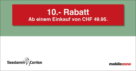 Ab einem Einkauf von CHF 49.95. Gültig im mobilezone Shop Pfäffikon ab einem Einkauf von CHF 49.95. Gültig auf Zubehör, exkl. SIM- & iTunes-/GooglePlay-Karten, Prepaid-Angebote, Aufladeguthaben, Dienstleistungen und Geschenkgutscheine.