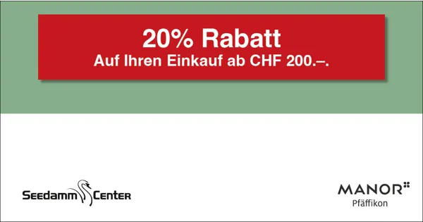 Einlösbar nur bei Manor Pfäffikon. Der Bon ist nur gültig für einen einmaligen Einkauf. Bitte diesen Manor-Bon vor dem Tippen an der Kasse abgeben. Keine Barauszahlung, keine Kontogutschrift. Nur gültig mit Manor World Mastercard® und Manor Treuekarte. Der Bon ist mit anderen Rabatten, Promotionen und Aktionen nicht kumulierbar. Kein Ersatz bei Verlust oder Diebstahl. Nicht gültig für den Online-Shop.