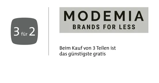 MODEMIA: Modetrends FOR LESS! Neuste Kollektionen von Top-Marken wie Angels, MAC, CECIL, comma, OPUS, someday, Monari, MORE & MORE, Marc O’Polo, RABE, s.Oliver, Street One und STREET ONE STUDIO – für Damen und Herren, klassisch bis trendig, immer zum attraktiven Preis! Der Bon ist nicht kumulierbar oder mit anderen Aktionen kombinierbar.