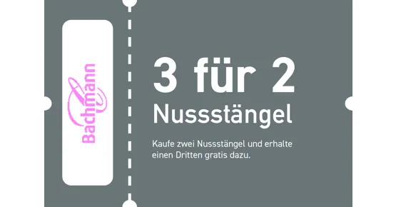 Kaufe zwei Nussstängel und erhalte einen Dritten gratis dazu. Gültig vom 02.03.2026 – 02.04.2026. Nur einlösbar im Pilatusmarkt.