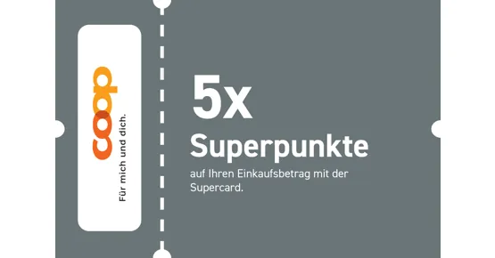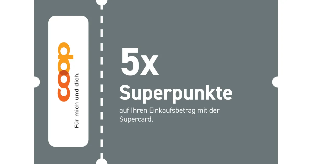 An der Kasse abgeben und persönliche Supercard vorweisen. Bon nur einmal einlösbar. Nicht gültig für Spirituosen/Aperitifs, Tabakwaren, Geschenkkarten/eVoucher, Reka-Card, Vignetten, Gebührenartikel (z.B. Kehrichtsäcke, -marken, Depot), Telefon- und Lotterieprodukte, Tickets, Presseartikel, Baby-Anfangsmilch, Tragtaschen, Onlineshop, eingemietete Shops, Tchibo Sortiment, Wein-Raritäten & Bordeaux Primeurs sowie Service-, Liefer- und Reparaturleistungen.