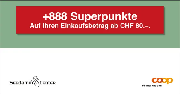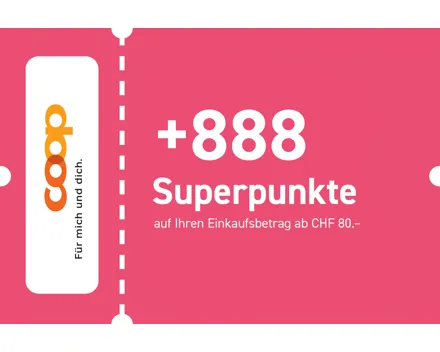 +888 Superpunkte auf Ihren Einkaufsbetrag ab CHF 80.–. Einlösbar in Ihrem Coop Supermarkt Pfäffikon SZ Seedamm. Bon an der Kasse abgeben und persönliche Supercard vorweisen. Bon nur einmal einlösbar. Nicht kumulierbar mit anderen Bons.