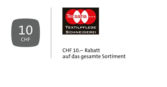 Nur 1 Gutschein pro Kunde und Einkauf einlösbar. Ausgenommen sind Hemden sowie Fremdarbeiten wie Teppich und Leder. Nicht kumulierbar mit anderen Rabatten und Aktionen.