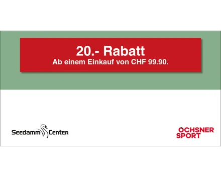 Nur einlösbar in deinem OCHSNER SPORT Store Seedamm-Center Pfäffikon. Nicht kumulierbar mit anderen Aktionen. Nicht gültig auf Mietware, Serviceleistungen, Geschenkkarten und Direktbestellungen.