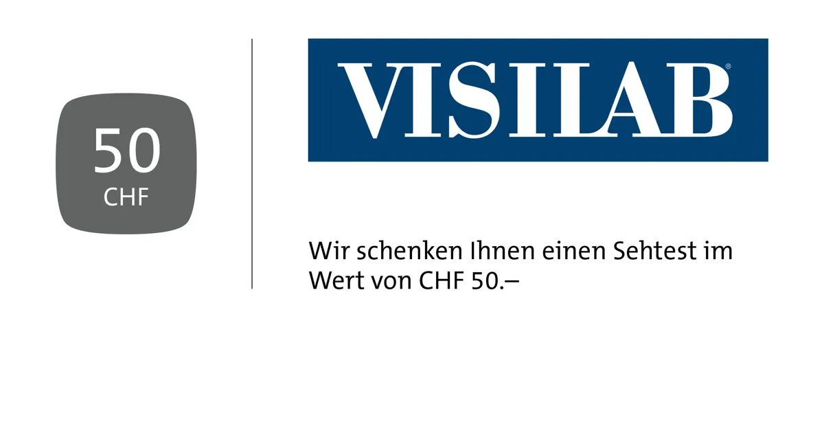 Beim Kauf einer Brille (Fassung und Gläser) schenken wir Ihnen einen Sehtest im Wert von CHF 50.–, wenn dieser im Visilab-Geschäft durchgeführt wird (Wert des Sehtests kann nicht vom Kaufpreis der Brille abgezogen werden). Kumulierbar mit anderen Angeboten.