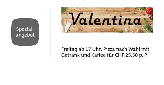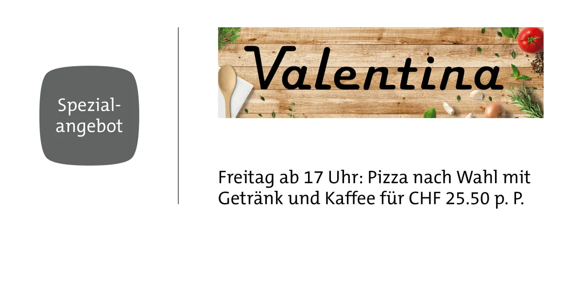 Freitag ab 17 Uhr: Pizza nach Wahl mit 3 dl Getränk und Kaffee für CHF 25.50 pro Person.
